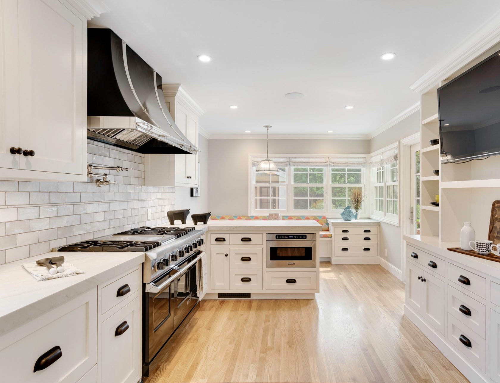 A crowded kitchen in a classic 1940’s home was remodeled to bring in more southern light and to leverage the views out to the garden. Painted cabinets, white stone counters and a built in bench seat form the backdrop for a bold black range and hood customized by the owner. The structural house corner was rebuilt and the electrical service main was moved, so the new windows could wrap that corner and focus toward the back yard. Oak flooring was continued from the original house and interior French doors were used, so that nearby rooms would flow together with the kitchen. An adjacent butler’s pantry was remodeled to match.